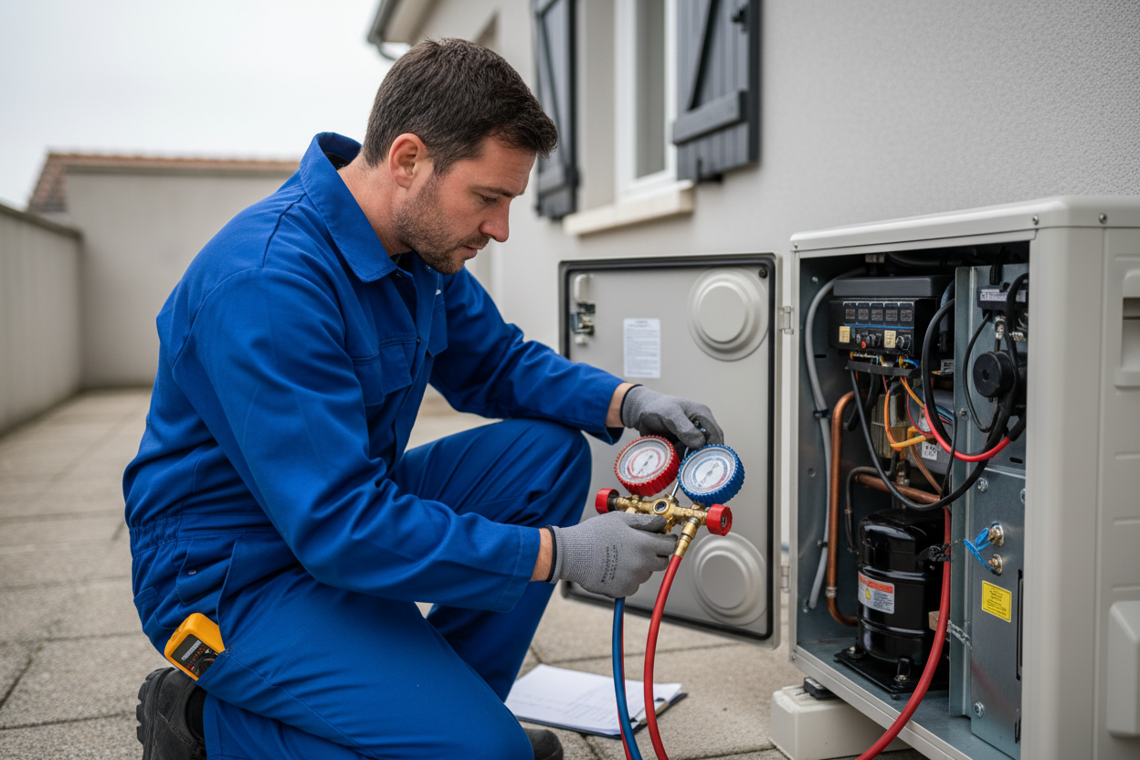 Le décret n°2020-912 impose un contrôle bisannuel par un opérateur qualifié. Il vérifie l'étanchéité du circuit frigorifique, mesure les performances, contrôle les paramètres de régulation. Un rapport est remis au propriétaire et doit être conservé. En copropriété, c'est le syndic qui gère ce suivi, mais en maison individuelle à Salon, c'est votre responsabilité directe.