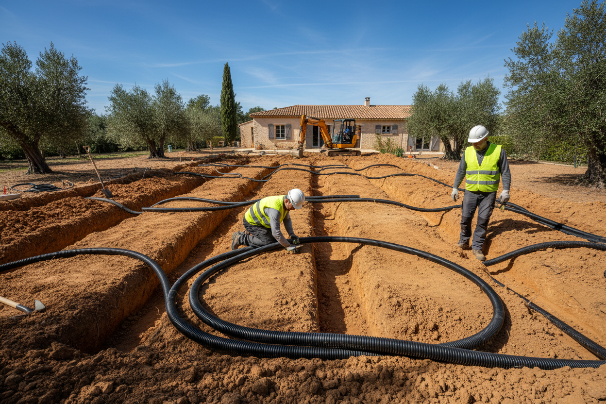 Pour les capteurs horizontaux, la règle du 1,5 fois la surface chauffée s'applique. Les bastides et mas provençaux avec leurs grands jardins sont idéaux. En revanche, dans les lotissements plus récents avec 300 m² de terrain total, les sondes verticales deviennent souvent la seule option géothermique viable. On peut aussi combiner un petit champ de capteurs avec un complément vertical.